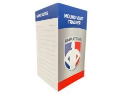 The Mound Visit Tracker is a bi-fold card with “Home” and “Visitor” side-by-side with plenty of space for writing “Game Notes” on the back.